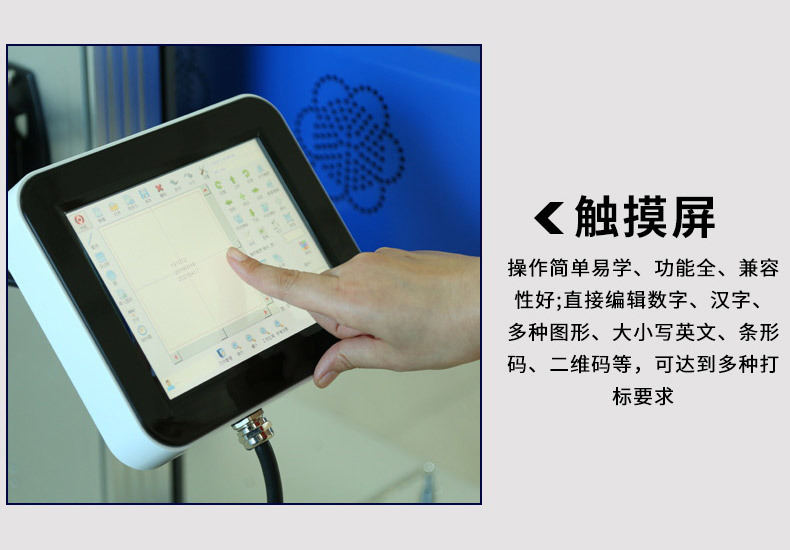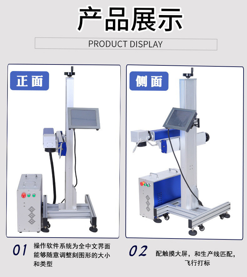 一、光纖激光打標(biāo)機,配觸摸屏,和生產(chǎn)線匹配,飛行打標(biāo)。適合加工金屬材質(zhì)和大部分的非金屬材質(zhì),包括稀有金屬和合金,還有ABS料,環(huán)氧樹脂等等。